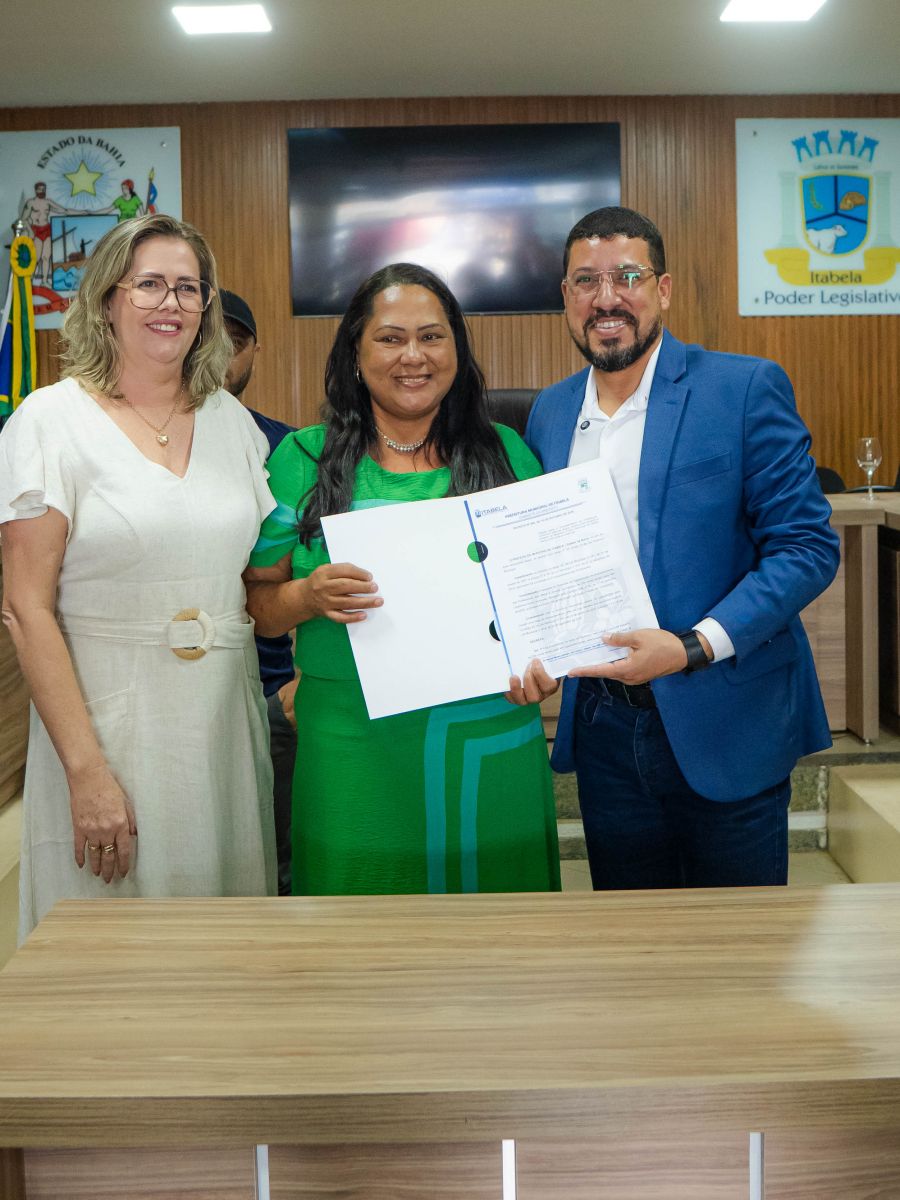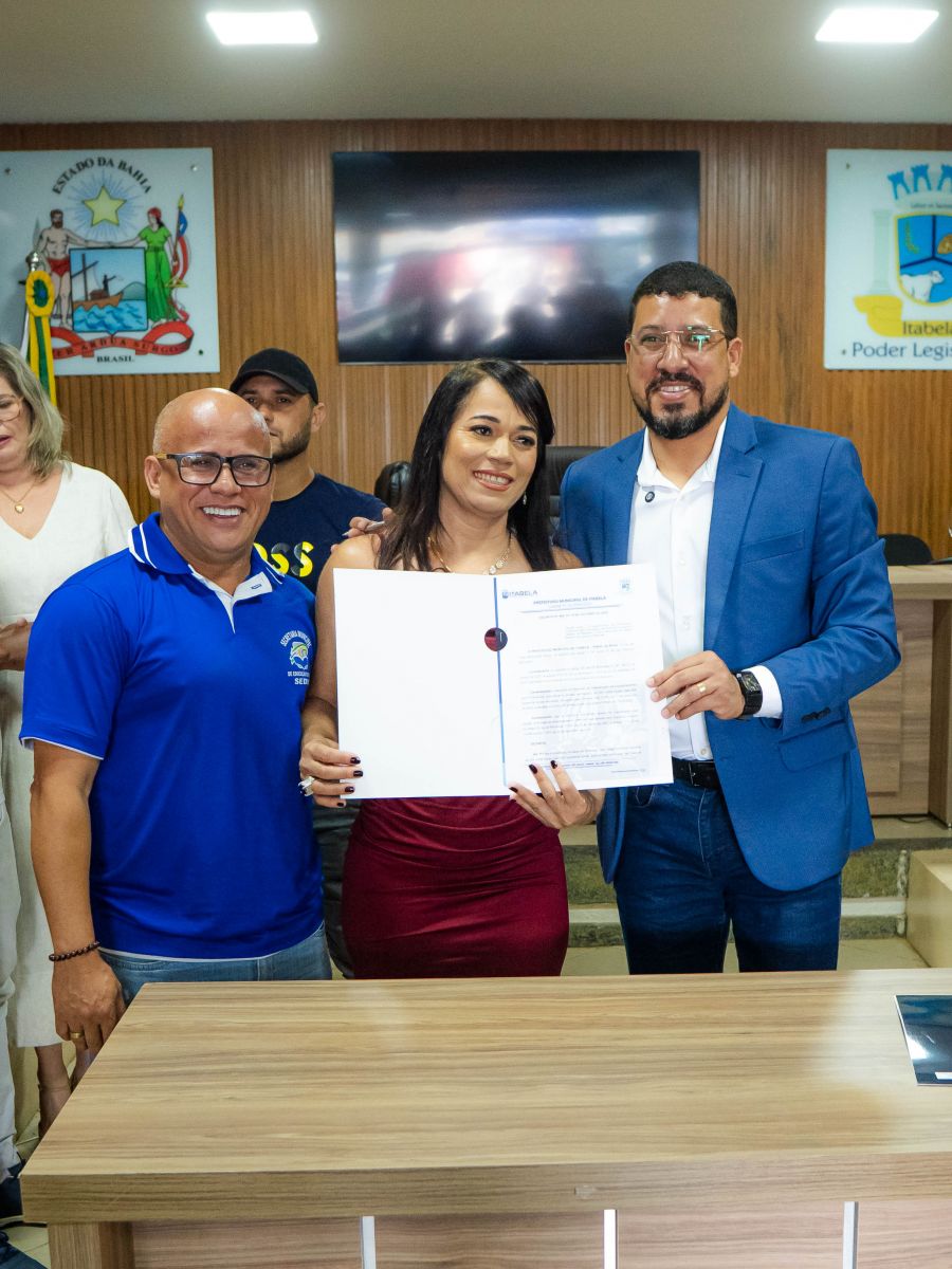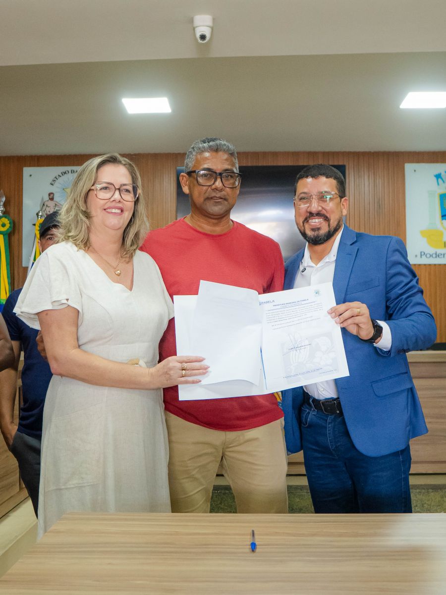 A cerimônia, realizada em homenagem ao Dia do Professor, aconteceu na Câmara de Vereadores e contou com a presença dos profissionais beneficiados, servidores da Educação, do prefeito Ricardo Flauzino, da presidente da Câmara, Simone Sossai, do representante da APLB, Ubiratan Herculano, e do representante do Conselho Municipal de Educação, Jorgley Santana.